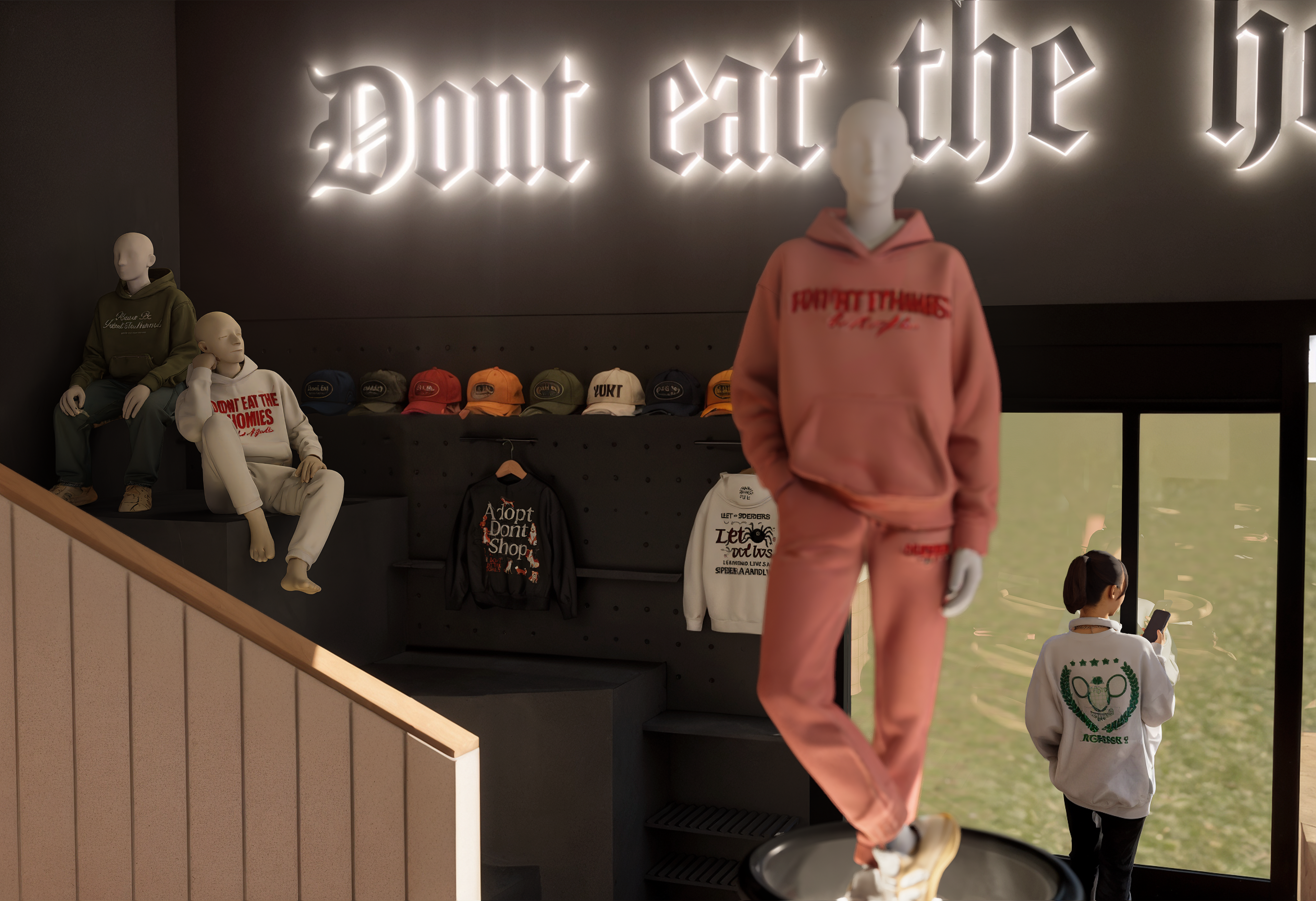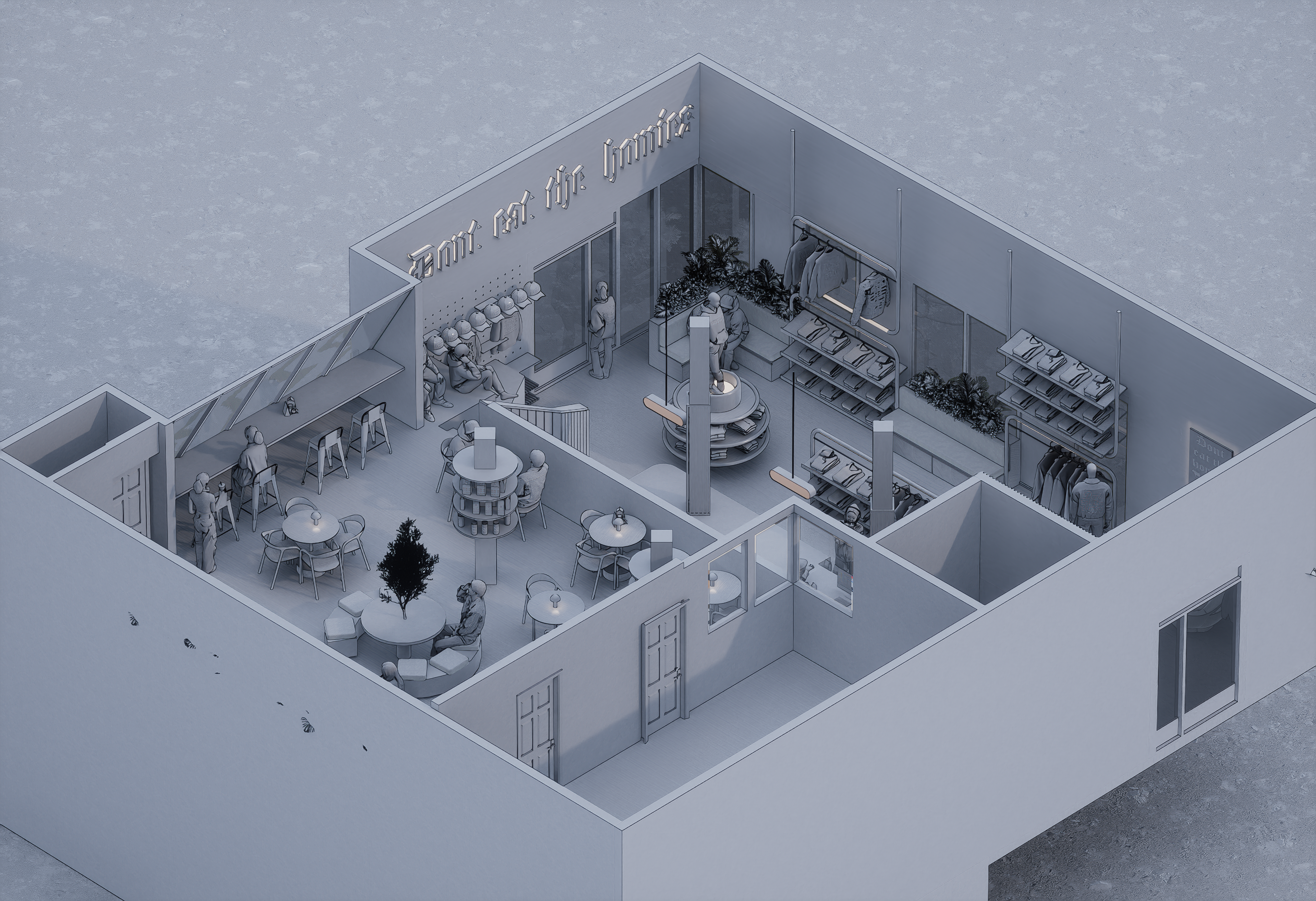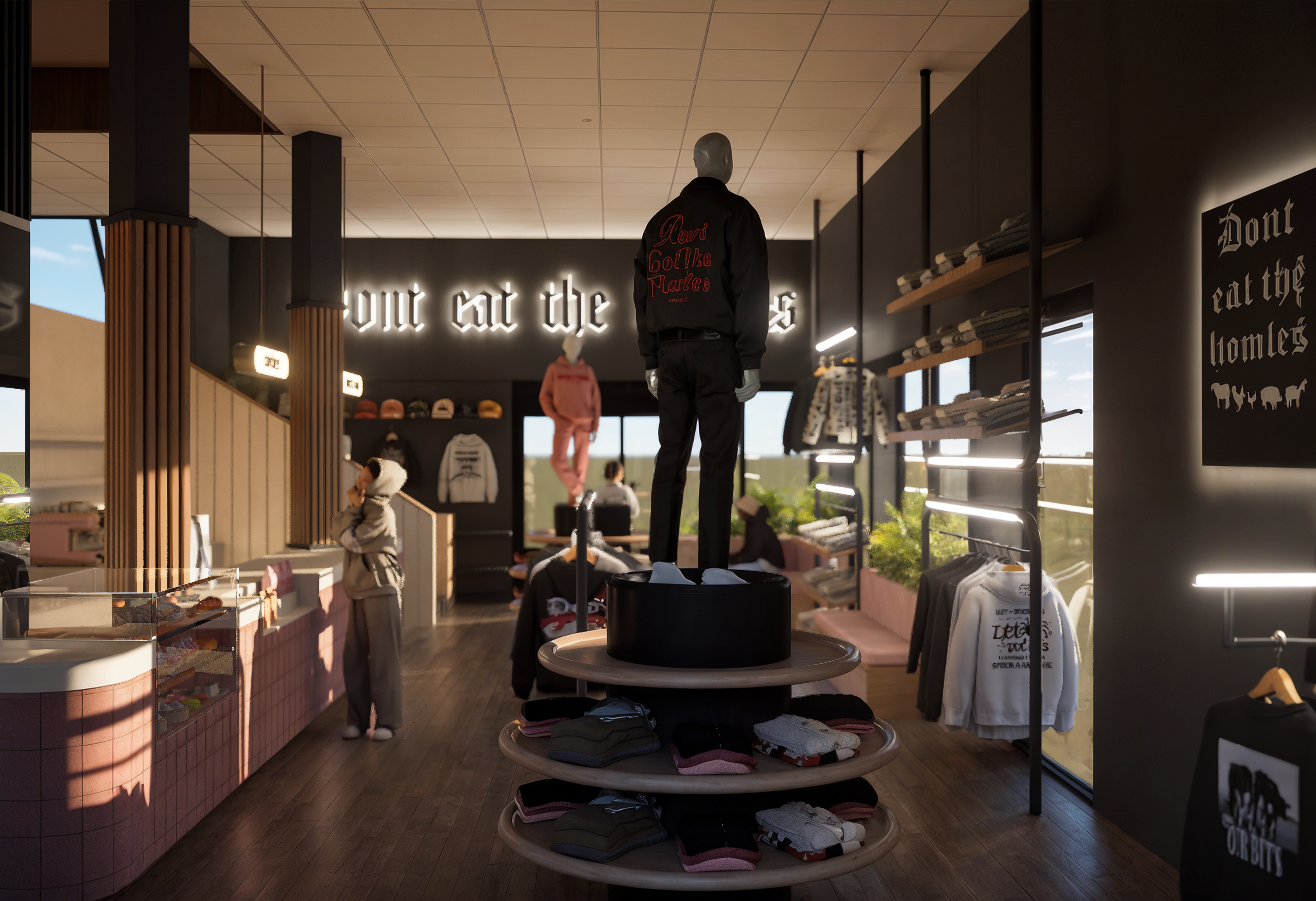 Este proyecto traduce la identidad de Don’t Eat The Homies una marca de moda vegana con espíritu urbano, libre, intergeneracional y activista en un espacio físico donde ropa, café y mensaje conviven de forma fluida y coherente.