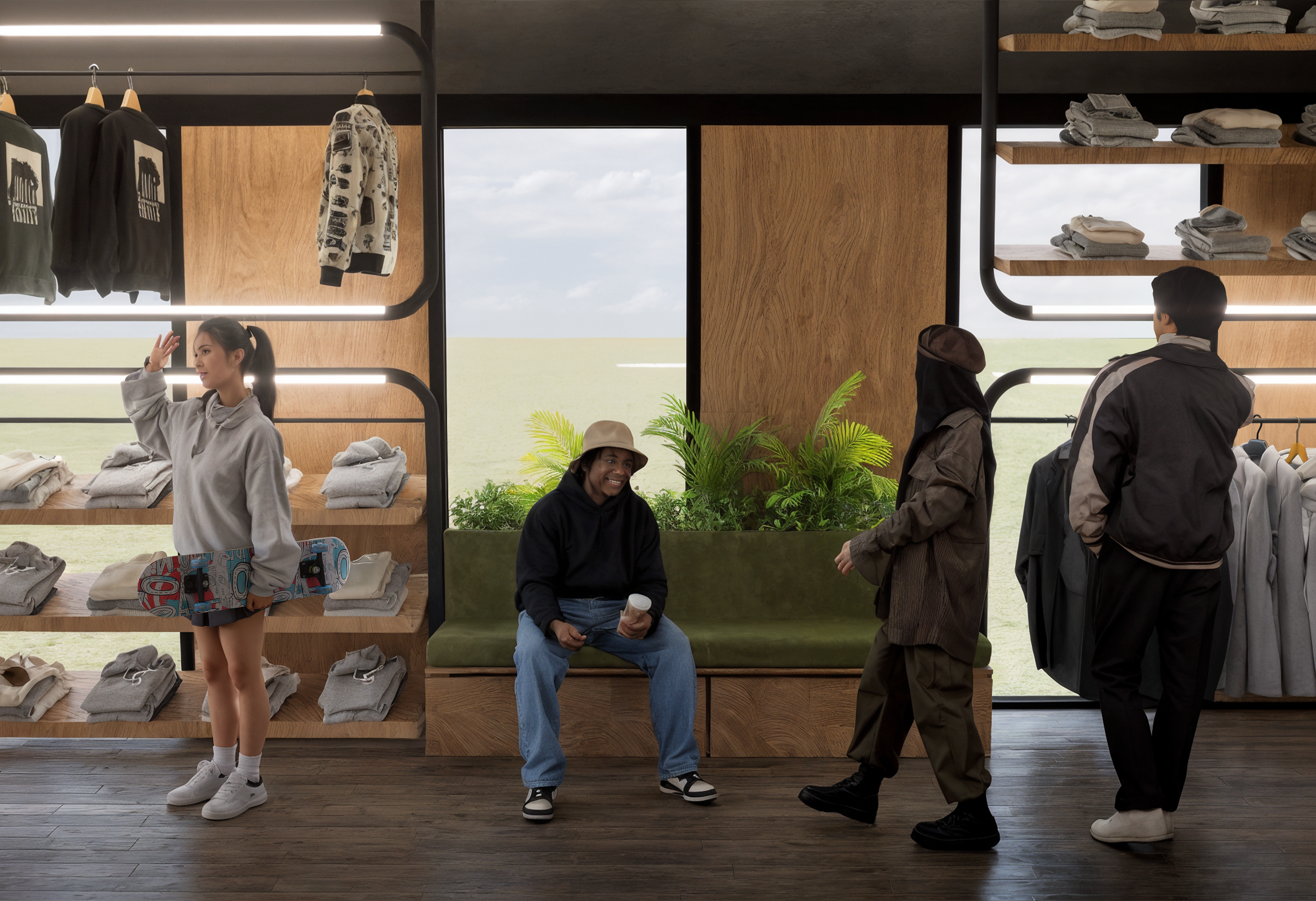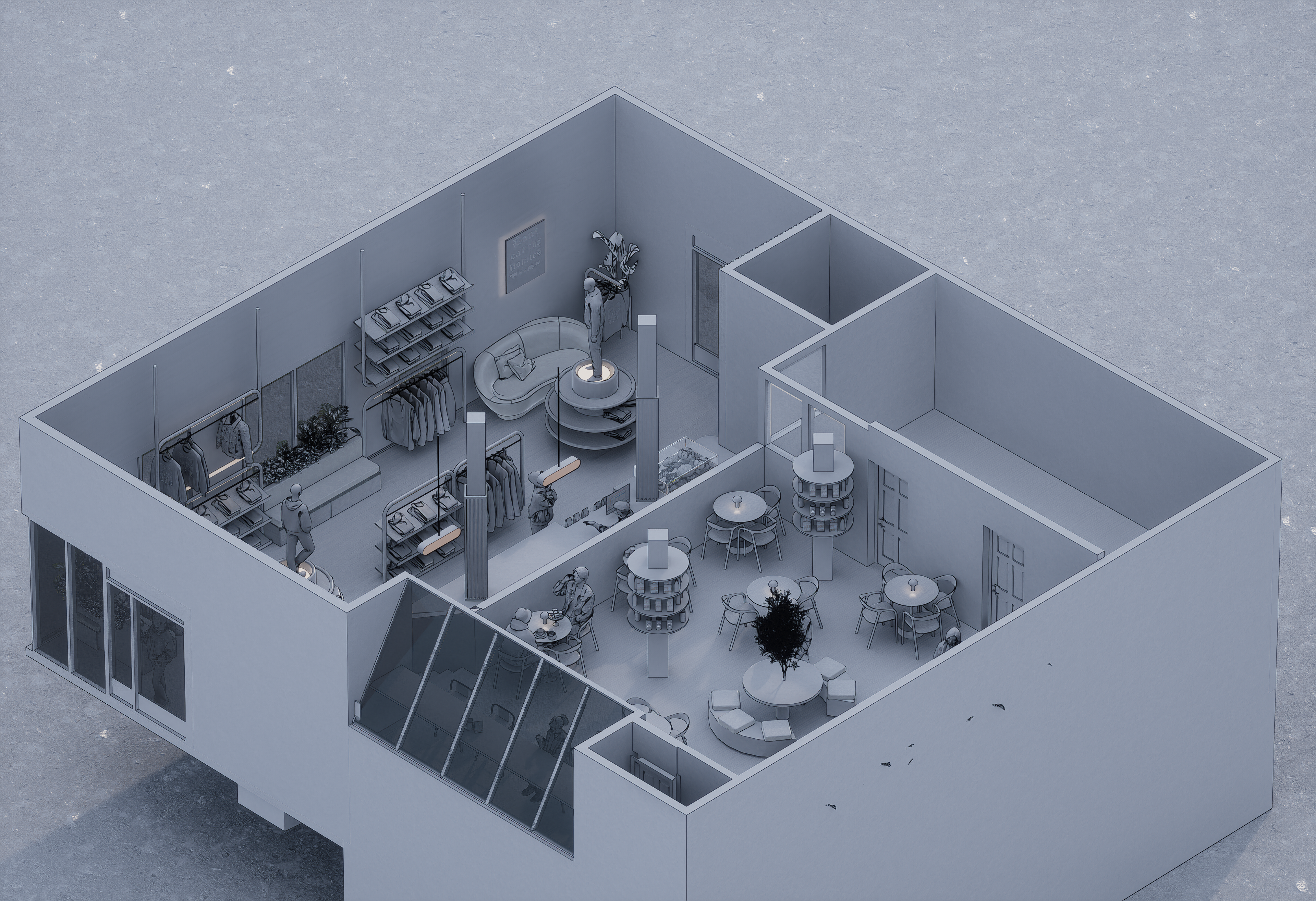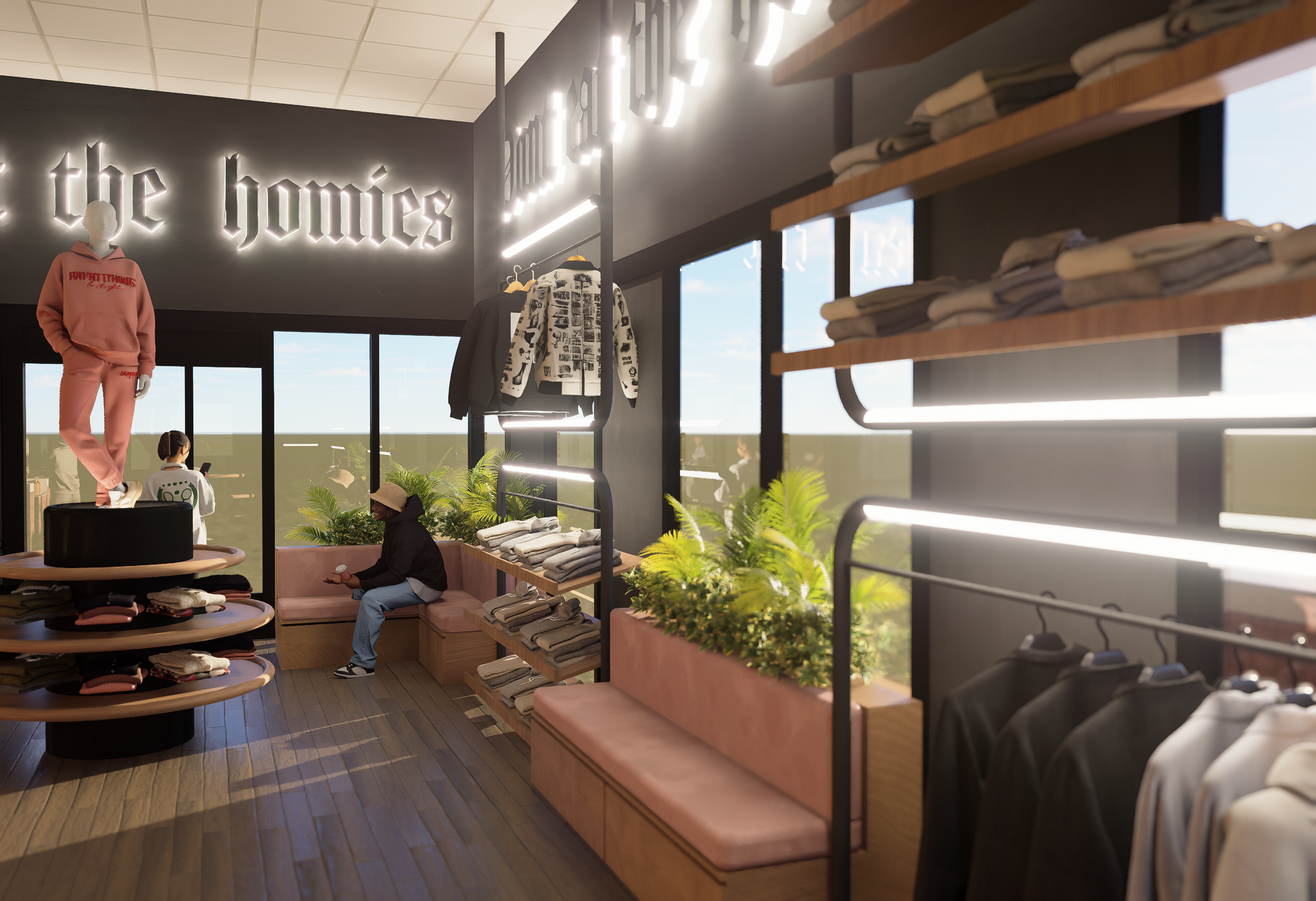 Este proyecto traduce la identidad de Don’t Eat The Homies una marca de moda vegana con espíritu urbano, libre, intergeneracional y activista en un espacio físico donde ropa, café y mensaje conviven de forma fluida y coherente.